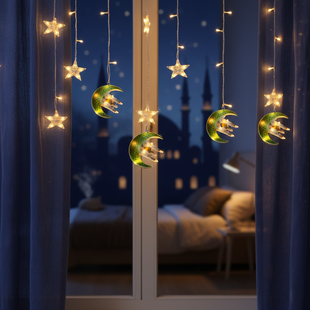 3 mt Fişli Yeşil Hilal Cami Yıldız Ramazan Perde LED