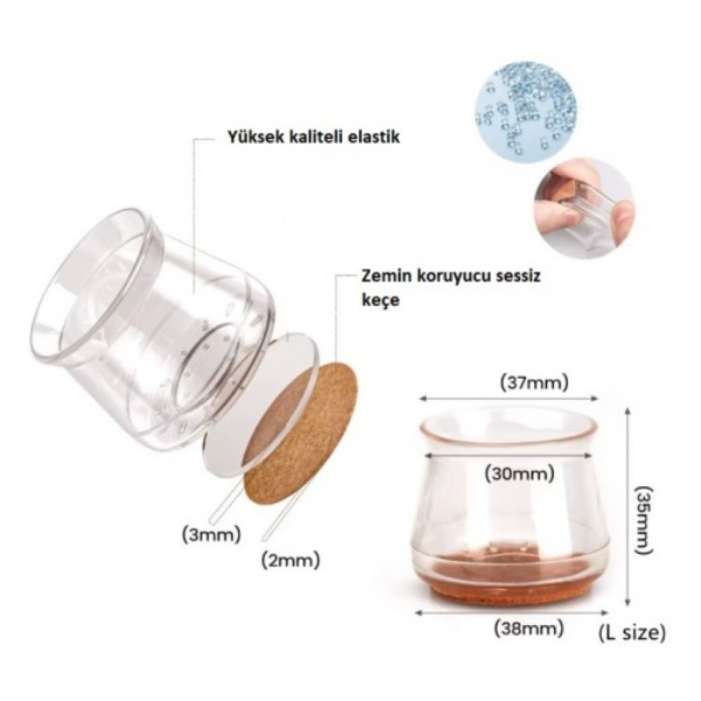 4'LÜ KEÇELİ ŞEFFAF SİLİKON SANDALYE AYAK KORUYUCU SETİÜrün Özellikleri4’lü Keçeli Şeffaf Silikon Sandalye Ayak Koruyucu Seti, mobilya ayaklarını hem zemine zarar vermeden kullanmanızı hem de sessiz bir hareket sağlamanızı amaçlayan pratik bir çözümdür. Alt kısmında yer alan entegre keçe tabanlı sandalye ayak koruyucu yapısı sayesinde sandalyeler zeminde kolayca kayar, iz bırakmaz ve gıcırtı ya da sürtünme sesi oluşturmaz. Dayanıklı ve esnek silikon malzemeden üretilmiş şeffaf silikon sandalye ayaklığı, sandalye ayaklarını sıkıca kavrar ve kullanım sırasında kolayca çıkmaz. Şeffaf yapısı sayesinde mobilya rengine uyum sağlar ve varlığı neredeyse fark edilmez. Çivi veya yapıştırıcı gerektirmeyen keçeli silikon sandalye ayak koruyucu, doğrudan ayağa geçirilerek hızlı ve zahmetsiz şekilde kullanıma hazır hale gelir. Yuvarlak ve kare ayaklı mobilyalarla uyumludur, kullanım öncesinde ölçü tablosuna dikkat edilmesi önerilir.Ürün Teknik Özellikleri Özellik Açıklama Ürün Adı 4'lü Keçeli Şeffaf Silikon Sandalye Ayak Koruyucu Seti Malzeme Esnek silikon + entegre keçe taban Ağız Çapı 30 mm (esneyebilir) Taban Genişliği 38 mm Yükseklik 35 mm Uyumluluk Yuvarlak ve kare sandalye ayakları Paket İçeriği4 Adet Keçeli Şeffaf Silikon Sandalye Ayak Koruyucu