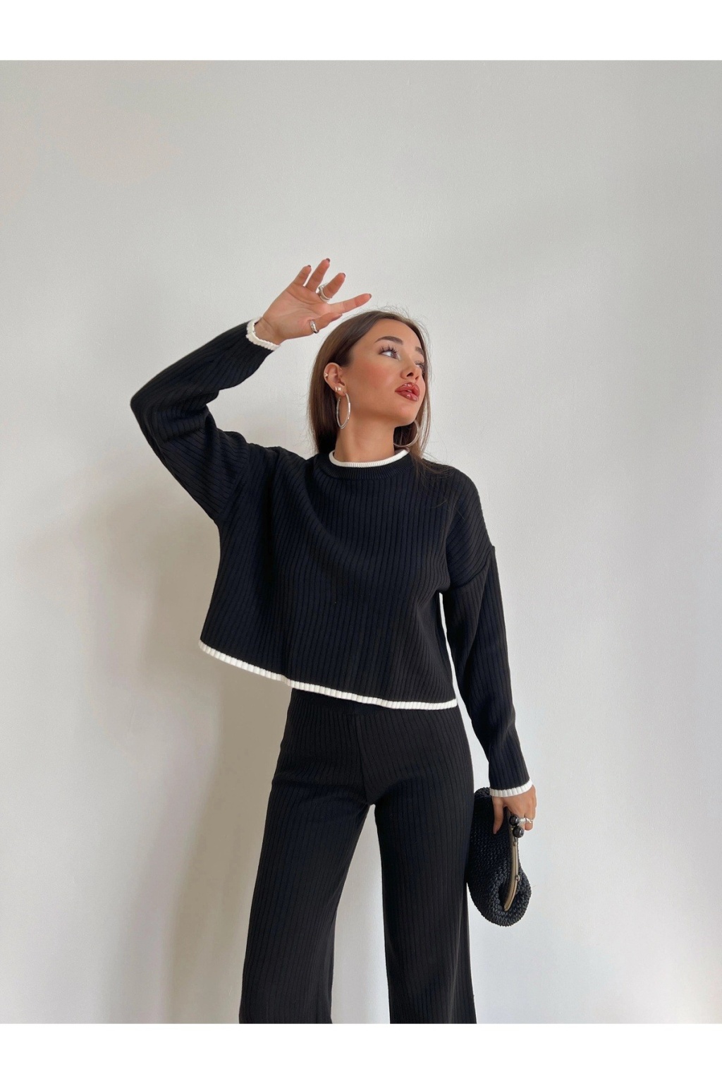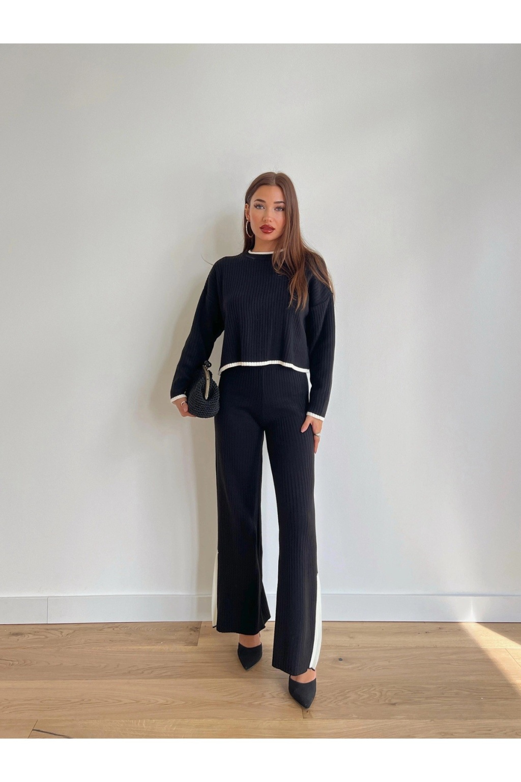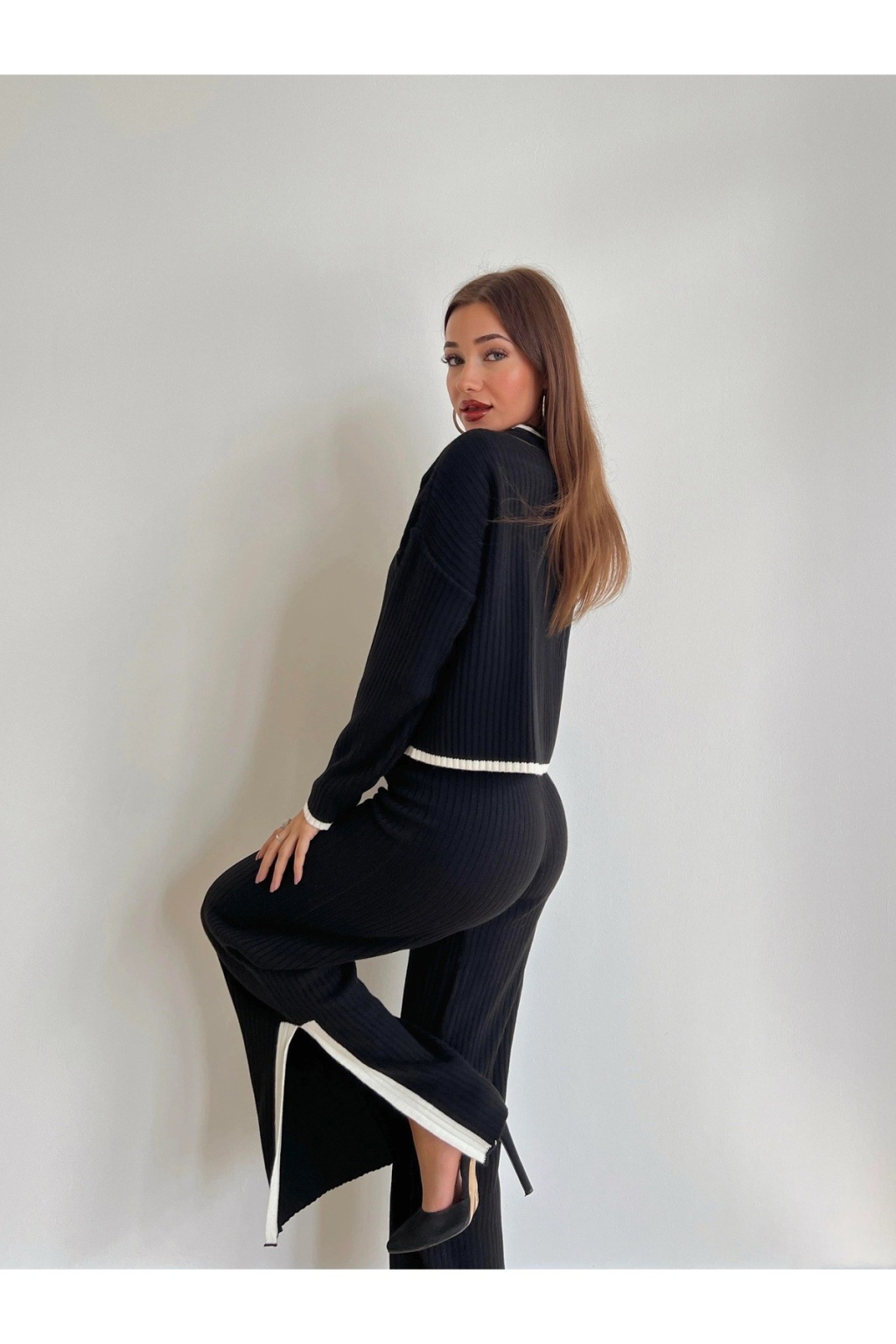 Bisiklet Yaka Crop Kazak Yırtmaçlı Pantolon Triko Alt-Üst Takım