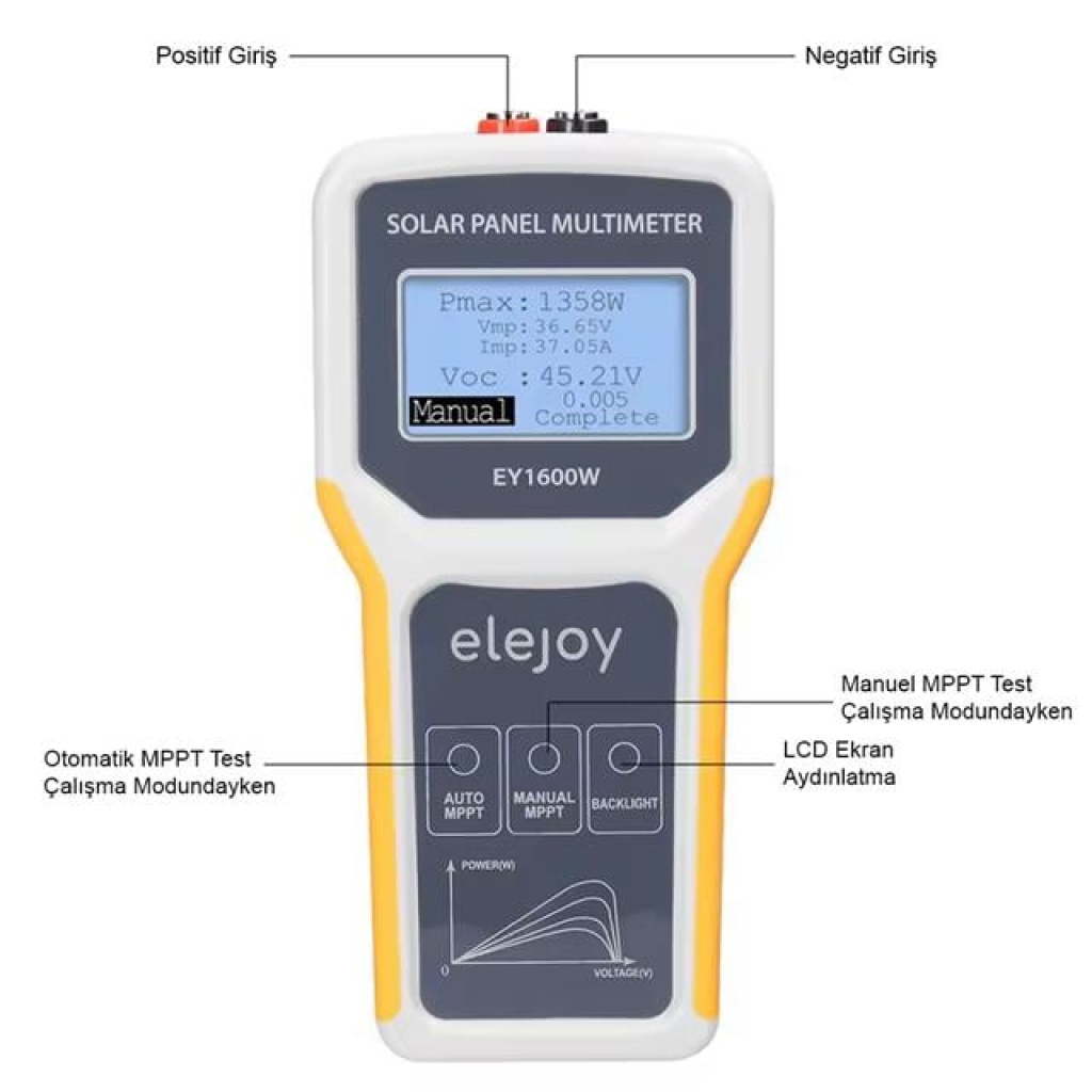 PowerMaster PM-26939 Fotovoltaik MPPT Solar Panel Voltaj Multimetre, güneş panellerinin performansını ölçmek ve izlemek için geliştirilmiş profesyonel bir cihazdır. 1600W'a kadar güç ölçümü yapabilme kapasitesi, 12-60V voltaj aralığı ve 0-60A akım ölçümü ile kapsamlı bir ölçüm çözümü sunar. LCD ekranı ve arka ışık fonksiyonu ile kullanımı kolaydır. Otomatik ve manuel ölçüm modları ile farklı kullanım senaryolarına uyum sağlar. Solar panel ile çalışır, batarya gerektirmez.