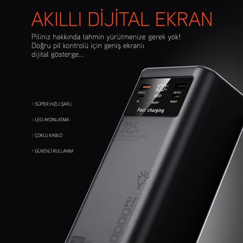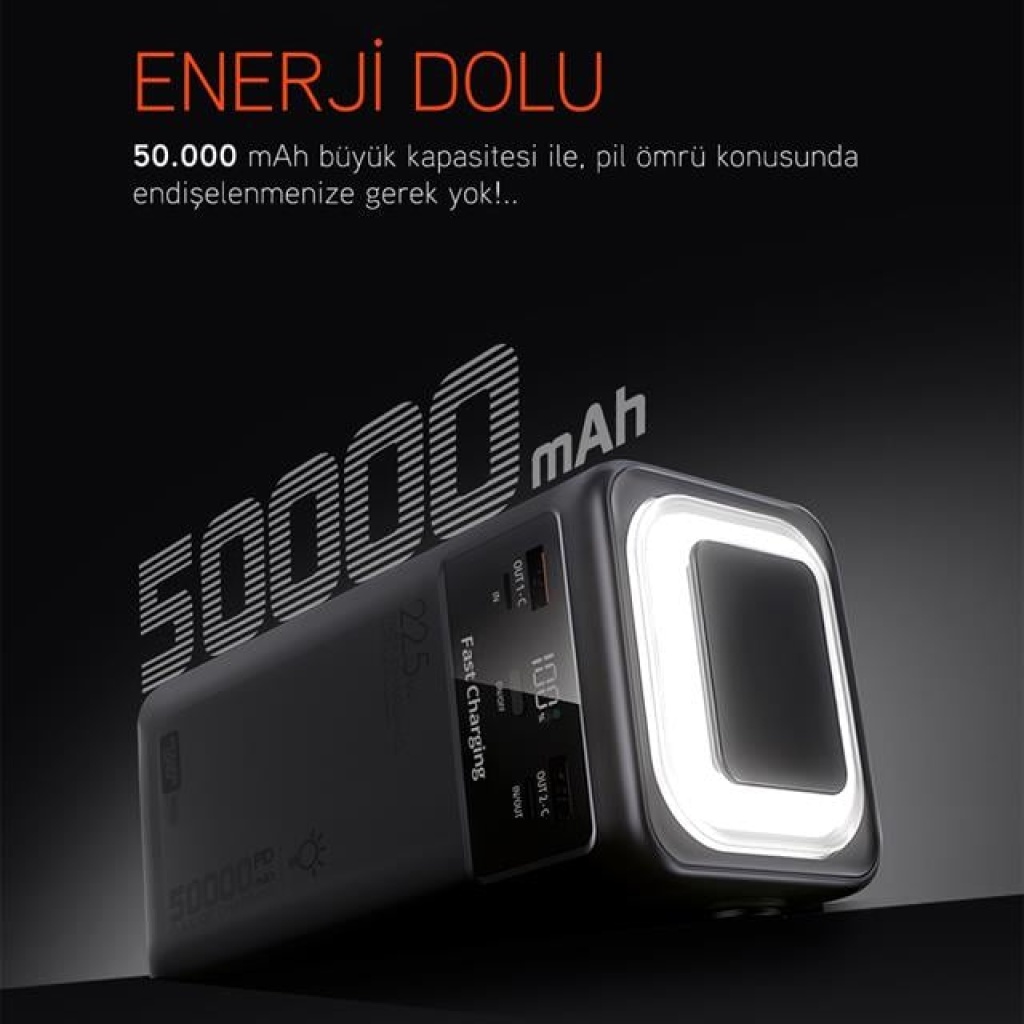 - Kesintisiz Enerji: 50.000 mAh kapasite, standart bir akıllı telefonu ortalama 10-12 kez tam şarj edebilir.