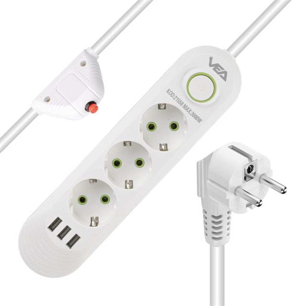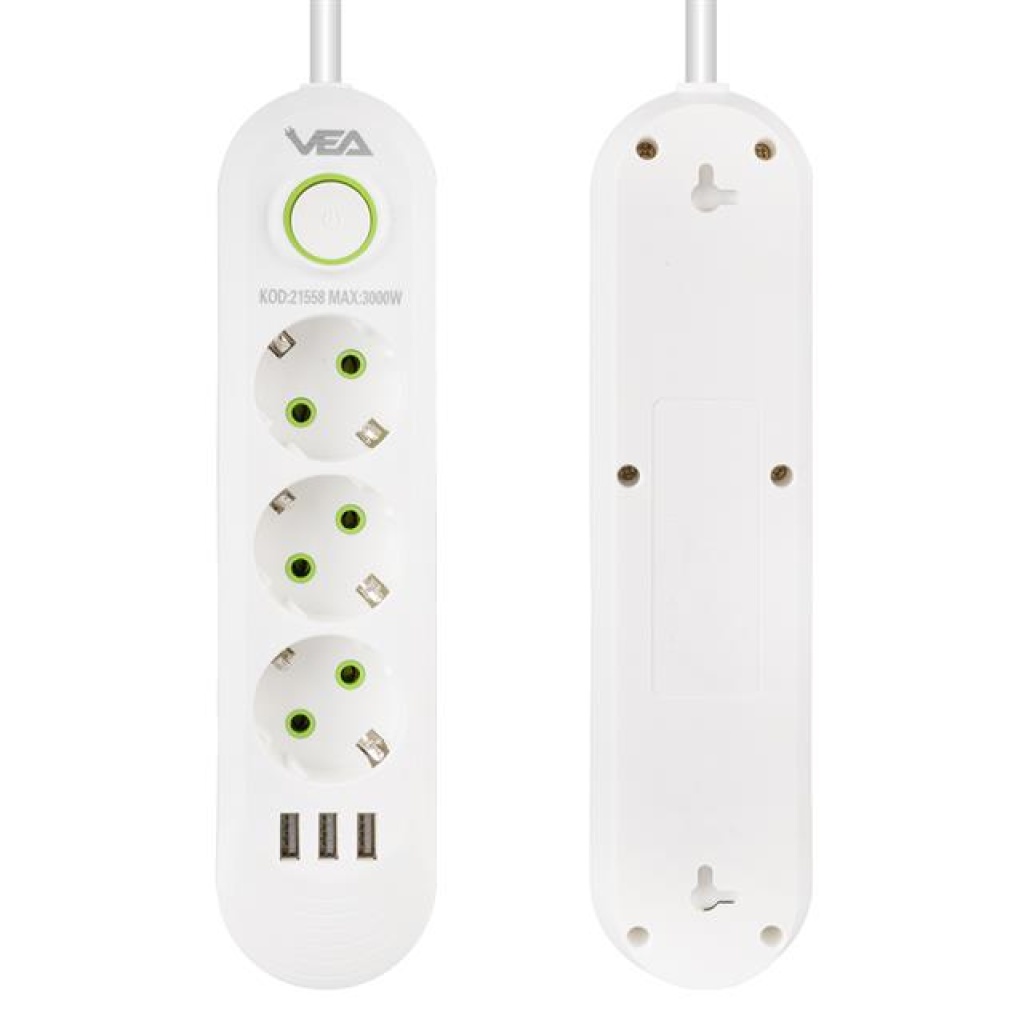 3 Priz ve 3 USB Çıkışı: Vea VA-21558, üç adet priz ve üç adet USB çıkışı ile donatılmıştır, böylece çok sayıda elektronik cihazı aynı anda şarj edebilir veya kullanabilirsiniz. Prizler, geniş aralıklı tasarımı sayesinde farklı priz tiplerine uyum sağlar.